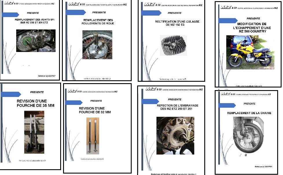 Par ailleurs des dossiers complets et bien documentés concernant des opérations spécifiques sont également disponibles comme, remplacement de la chaine de transmission, révision de l'embrayage 250 ETZ, remplacement des pneus ect... Si vous envisagez une intervention quelconque sur votre MZ, consultez nous, nous avons surement un dossier correspondant.